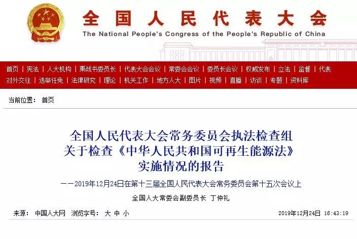 12月24日,中國(guó)人大網(wǎng)公布了全國(guó)人大常委會(huì)副委員長(zhǎng)丁仲禮在第十三屆全國(guó)人民代表大會(huì)常務(wù)委員會(huì)第十五次會(huì)議上發(fā)表的全國(guó)人民代表大會(huì)常務(wù)委員會(huì)執(zhí)法檢查組關(guān)于檢查《中華人民共和國(guó)可再生能源法》實(shí)施情況的報(bào)告。
