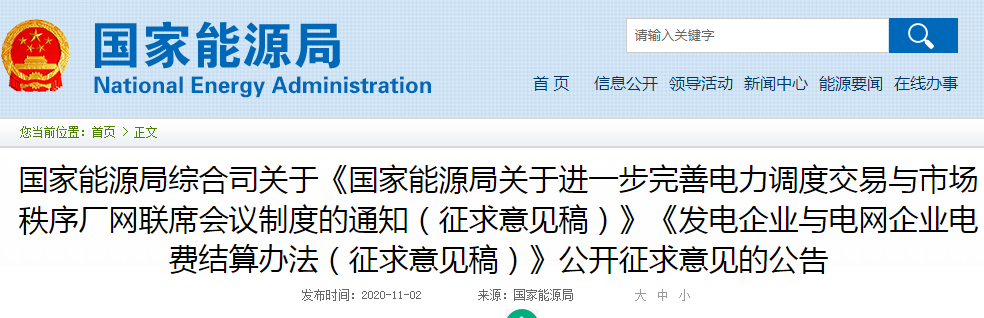 國家能源局綜合司關(guān)于《國家能源局關(guān)于進(jìn)一步完善電力調(diào)度交易與市場秩序廠網(wǎng)聯(lián)席會議制度的通知(征求意見稿)》《發(fā)電企業(yè)與電網(wǎng)企業(yè)電費結(jié)算辦法(征求意見稿)》公開征求意見的公告
