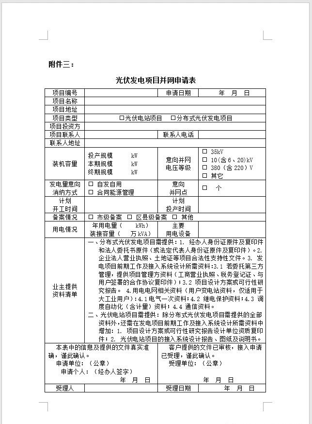 項(xiàng)目業(yè)主攜營(yíng)業(yè)執(zhí)照、發(fā)改委備案文件、接入系統(tǒng)批復(fù)、初步設(shè)計(jì)審查意見(jiàn)、施工圖紙及一次系統(tǒng)圖(設(shè)計(jì)藍(lán)圖)到運(yùn)檢部專責(zé)處填寫《光伏發(fā)電項(xiàng)目并網(wǎng)申請(qǐng)表》。受理后由區(qū)供電分公司基建處安排變電站間隔和線路施工等相關(guān)事宜。項(xiàng)目業(yè)主協(xié)助電網(wǎng)企業(yè)開(kāi)展送出工程可研設(shè)計(jì),共同推動(dòng)送出工程與光伏發(fā)電項(xiàng)目同步建設(shè)、同步投運(yùn)。