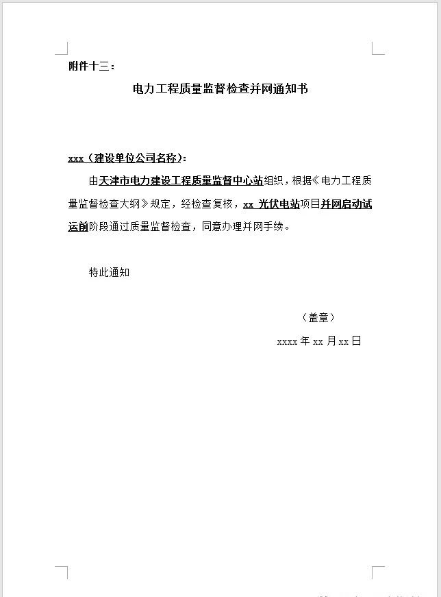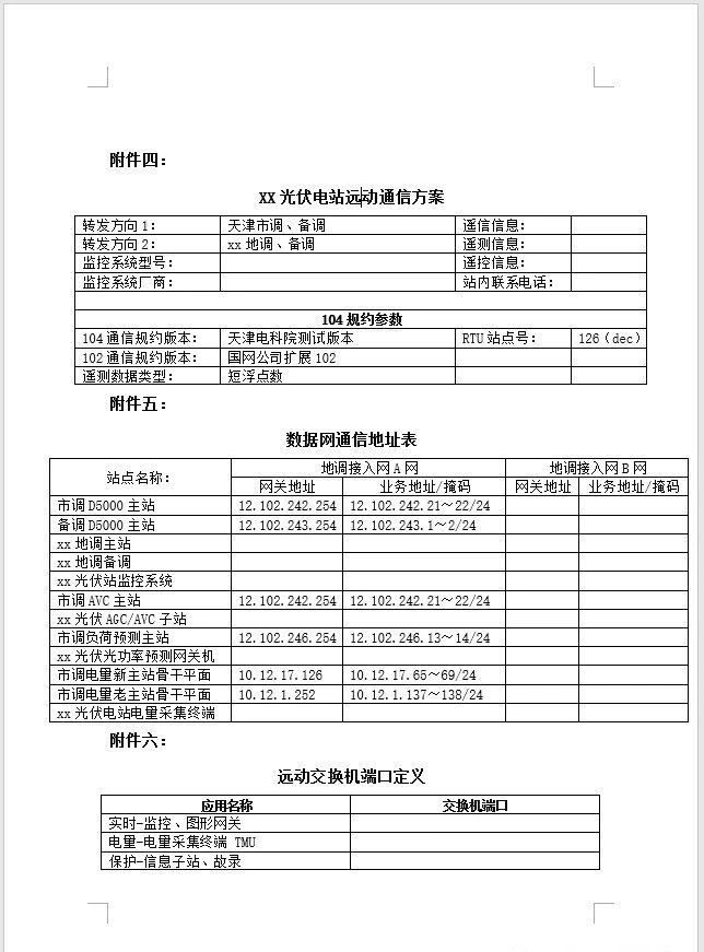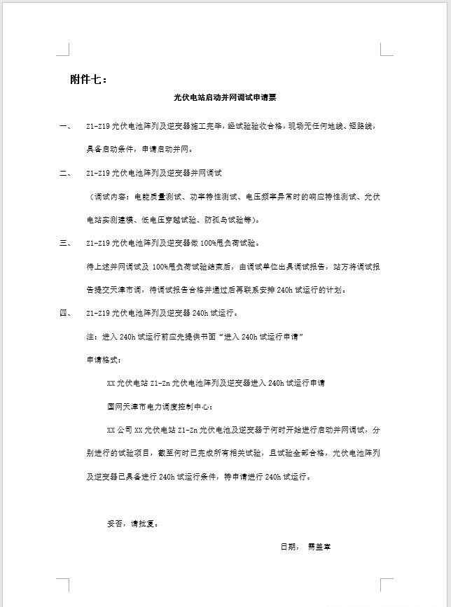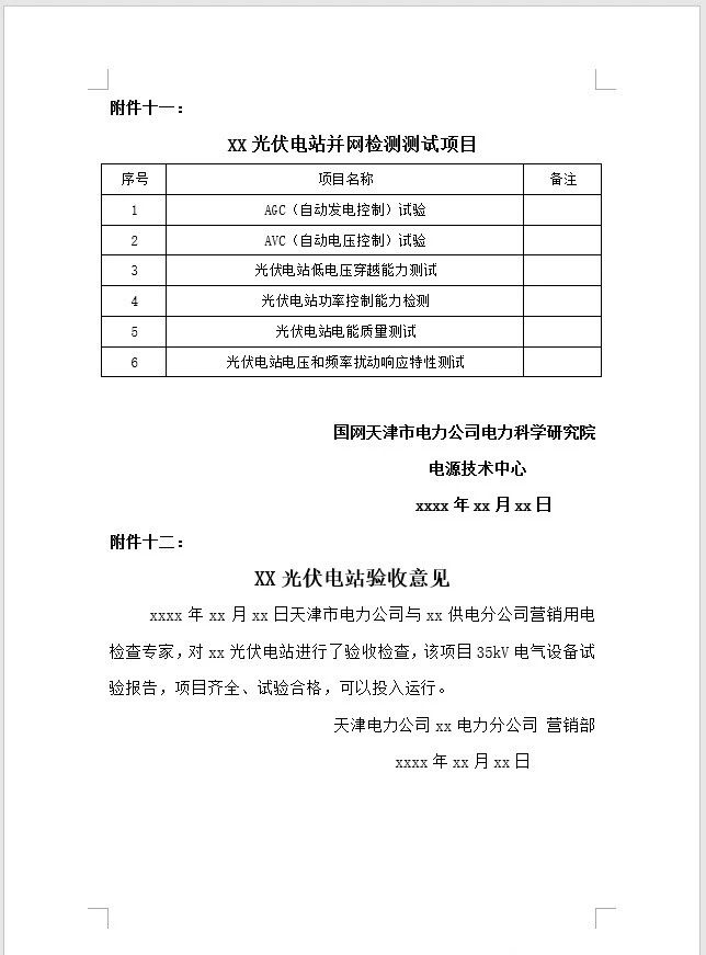 由國(guó)網(wǎng)天津市電力公司電力科學(xué)技術(shù)研究院電源技術(shù)中心出具《XX光伏電站并網(wǎng)檢測(cè)測(cè)試項(xiàng)目》以及《XX光伏電站并網(wǎng)檢測(cè)技術(shù)方案》;與天津市津電信通科技有限公司簽訂的《通信運(yùn)維技術(shù)服務(wù)合同》;經(jīng)電力公司批準(zhǔn)的《XX光伏電站倒送電方案》、《XX光伏電站并網(wǎng)啟動(dòng)方案》;《xx光伏電站典型操作票》。