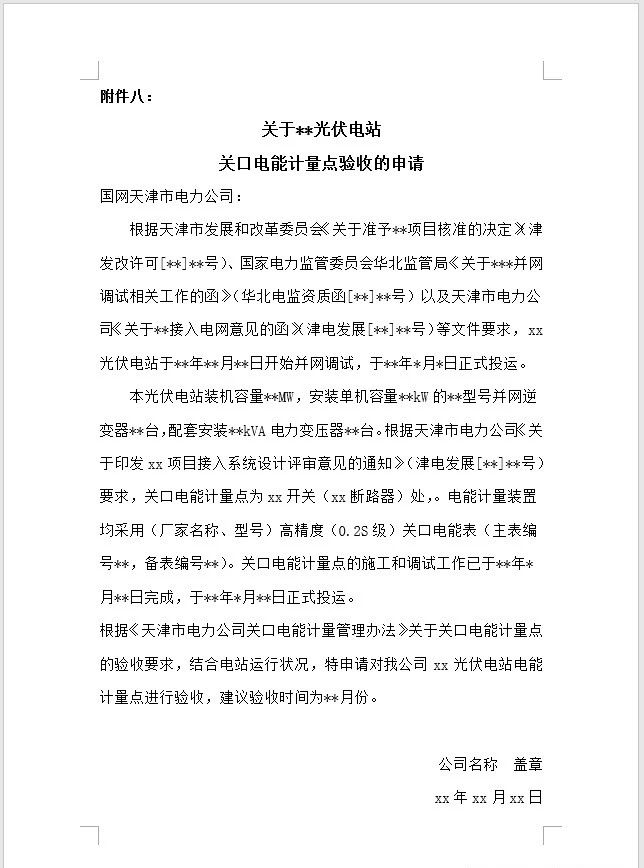 參照《關(guān)口電能計(jì)量系統(tǒng)投運(yùn)后驗(yàn)收技術(shù)資料》,向國(guó)網(wǎng)天津市電力公司提交《關(guān)于xx電站關(guān)口電能計(jì)量點(diǎn)驗(yàn)收的申請(qǐng)》,市局及縣供電公司安排發(fā)策部、交易中心、營(yíng)銷部、計(jì)量科等專業(yè)人員進(jìn)行現(xiàn)場(chǎng)驗(yàn)收,并出具驗(yàn)收?qǐng)?bào)告,是電站轉(zhuǎn)商運(yùn)的支持性文件之一。