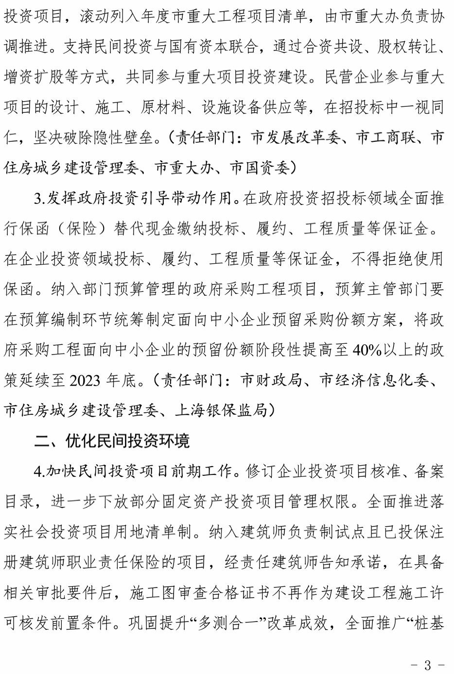 第一、加快民間投資項目前期工作。重點聚焦民間投資項目前期、工程建設(shè),用好上海建設(shè)工程領(lǐng)域?qū)徟贫雀母镒钚鲁晒?,把受到企業(yè)歡迎的“樁基先行”、“多測合一”、項目用地清單制等改革措施進(jìn)一步落實落地,推進(jìn)實施“水電氣網(wǎng)聯(lián)合報裝”等改革新措施,為民間投資項目減環(huán)節(jié)、減時間、提效率。