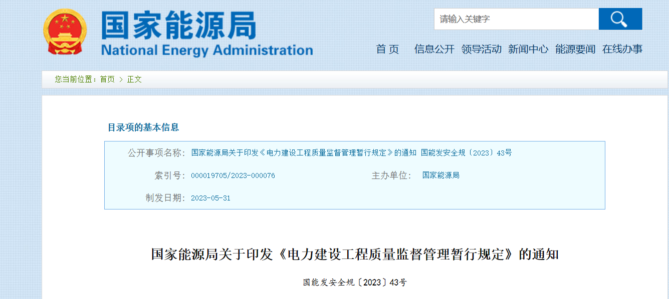 國家能源局關(guān)于印發(fā)《電力建設(shè)工程質(zhì)量監(jiān)督管理暫行規(guī)定》的通知國能發(fā)安全規(guī)〔2023〕43號