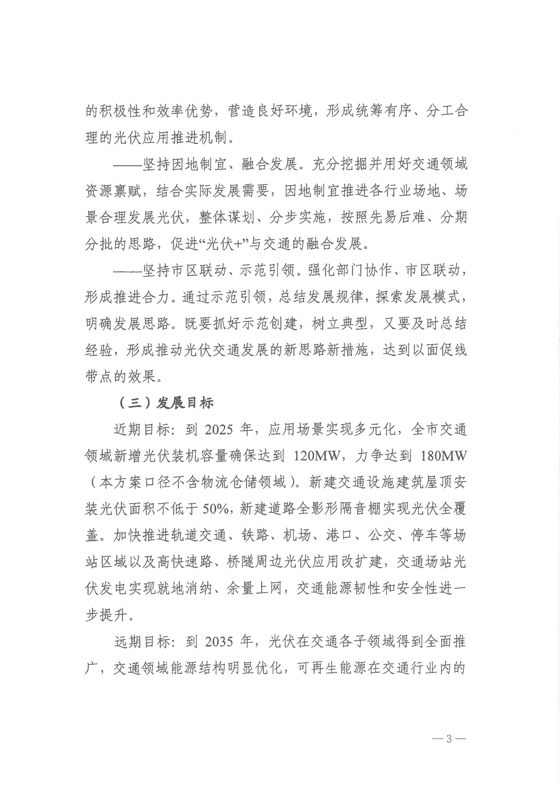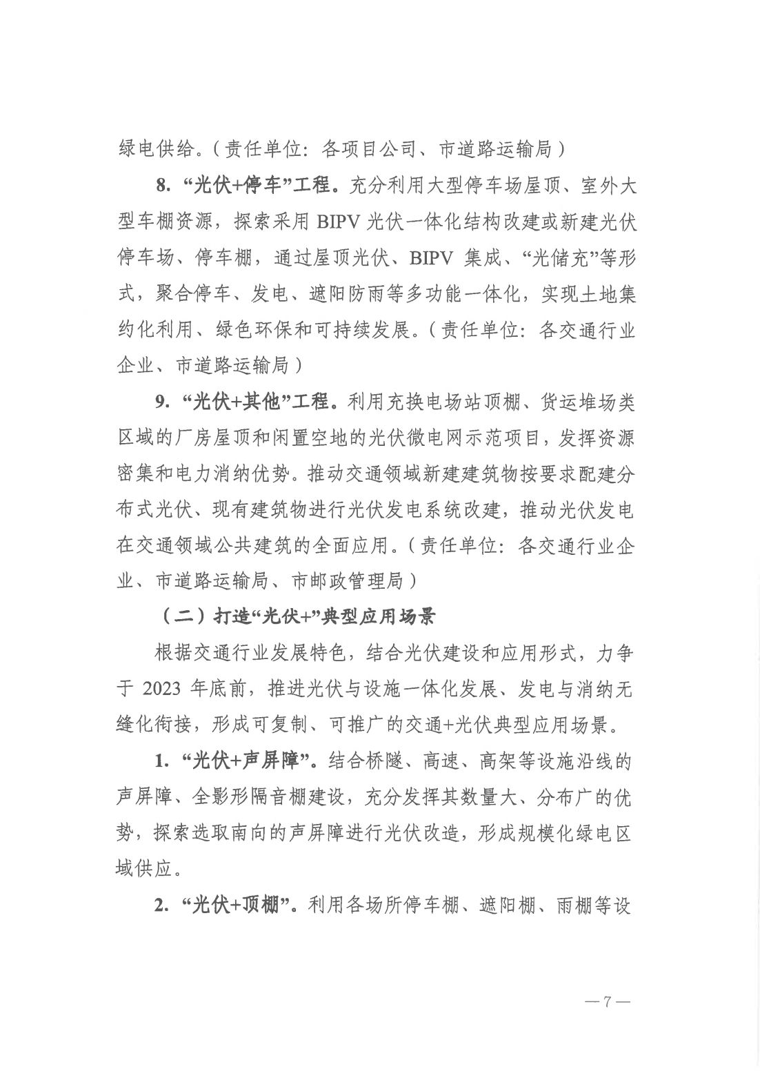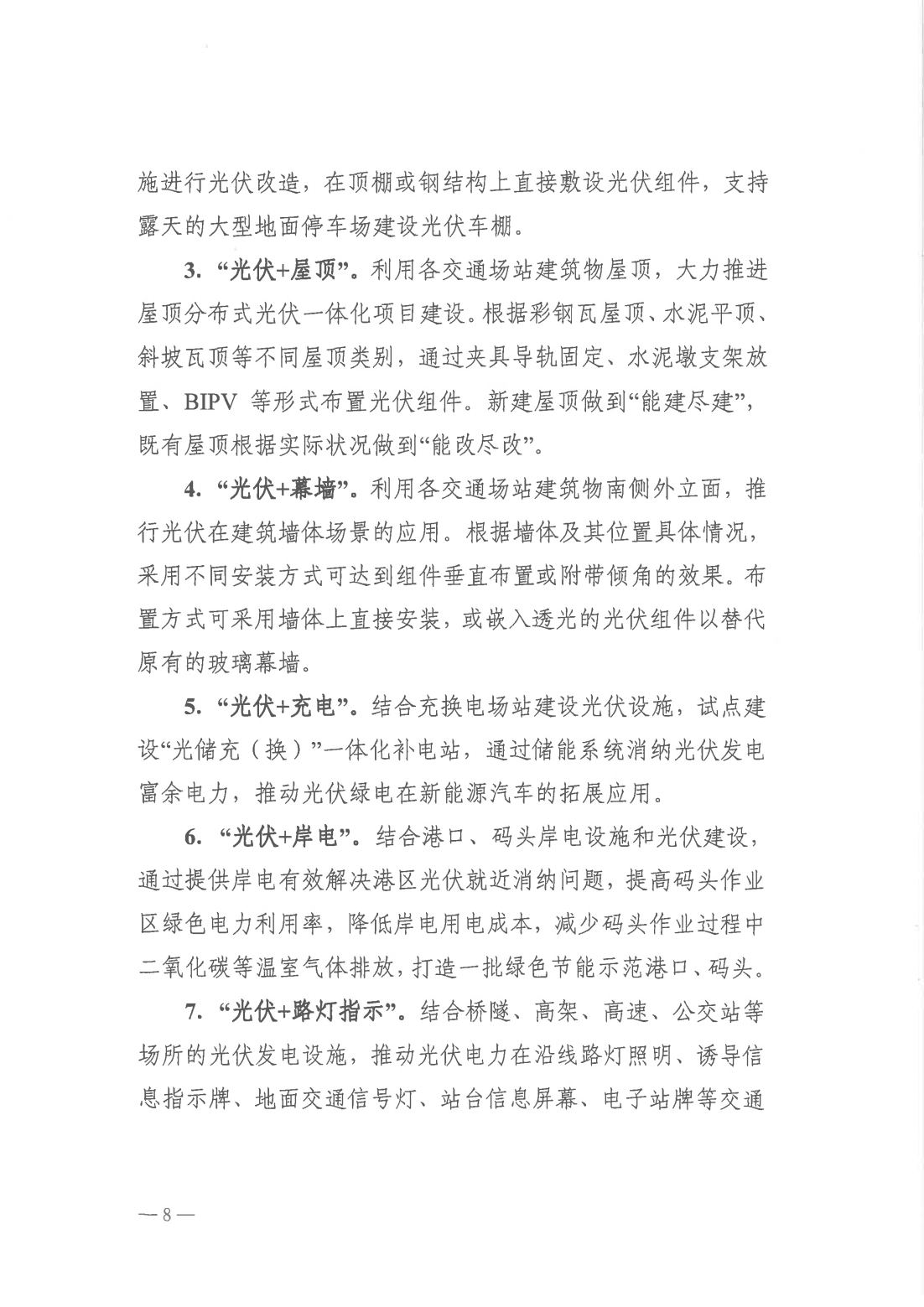 方案顯示,按照高水平設(shè)計、高標準建設(shè)、高質(zhì)量應(yīng)用的原則,重點利用地鐵、機場、火車站(高鐵站)、港口、公交、橋隧、高速、停車場等交通基礎(chǔ)設(shè)施(場地)推進光伏應(yīng)用,結(jié)合交通領(lǐng)域場地資源,以面、連線、帶點,打造一批綠色工程,形成示范效應(yīng)。