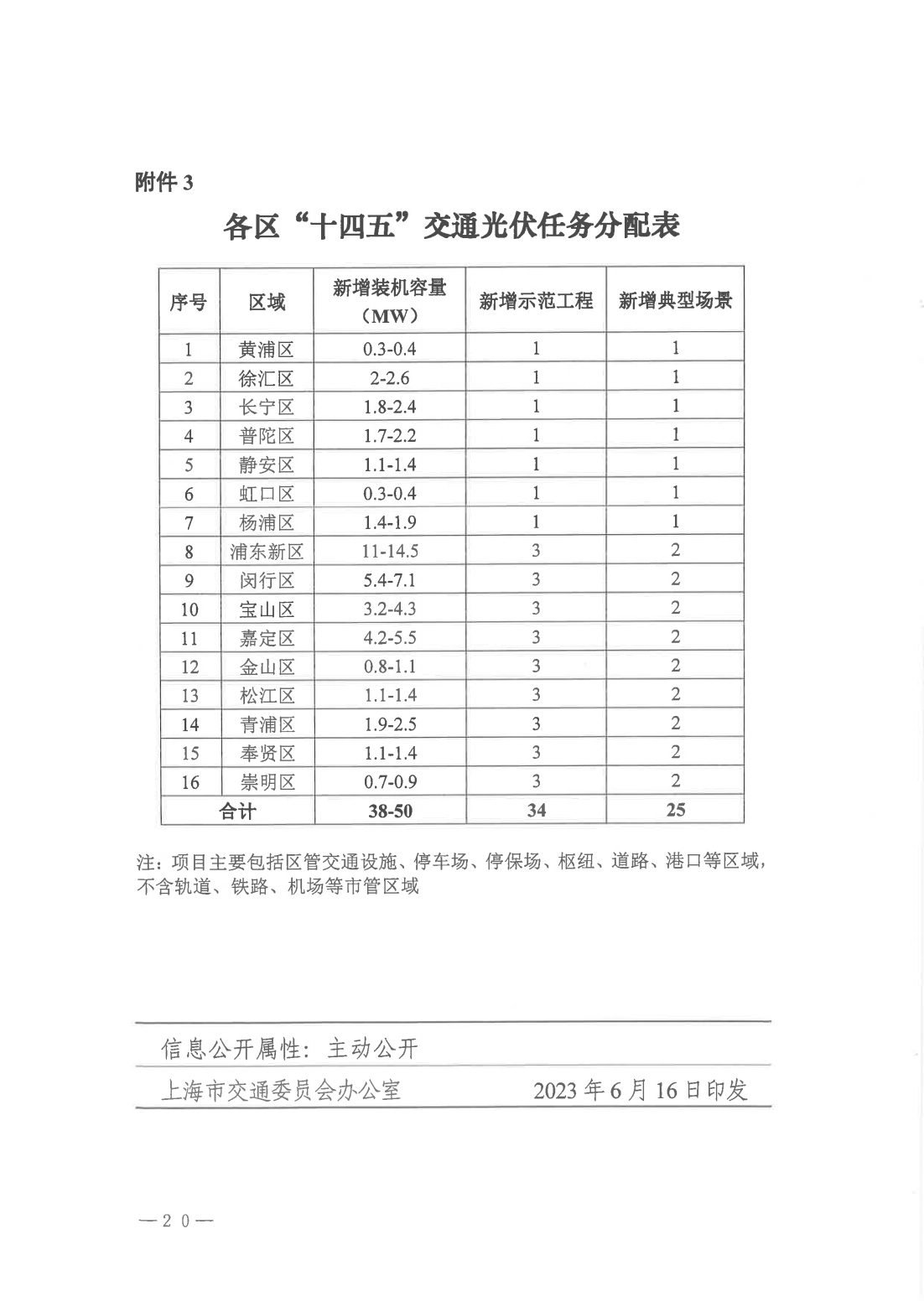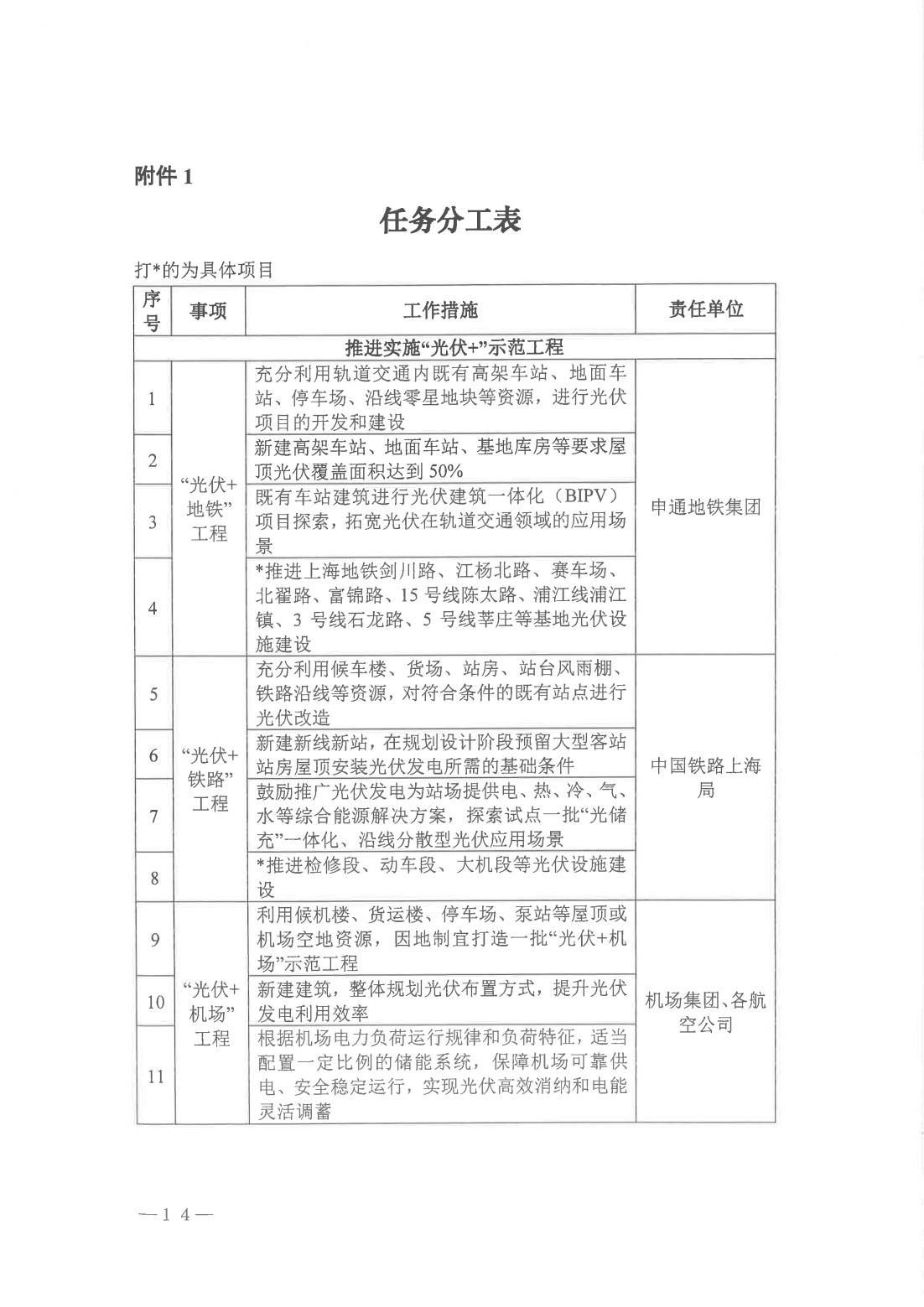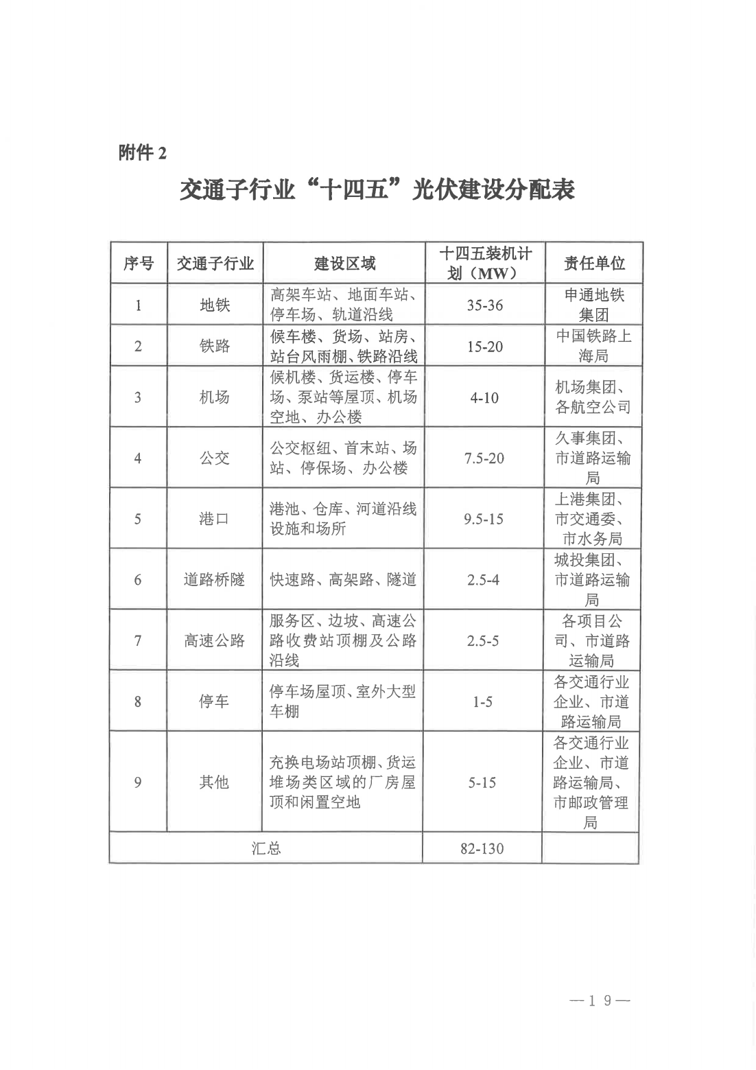 值得注意的是,文件還發(fā)布了推進實施“光伏+”示范工程任務(wù)分工表,申通地鐵集團,中國鐵路上海局以及各機場集團、各航空公司,市道路運輸局、各區(qū)政府,負責(zé)相關(guān)領(lǐng)域的“光伏+”示范工程建設(shè)。全市計劃十四五“光伏+交通”裝機到82-130MW,各區(qū)新增裝機容量合計38-50MW。