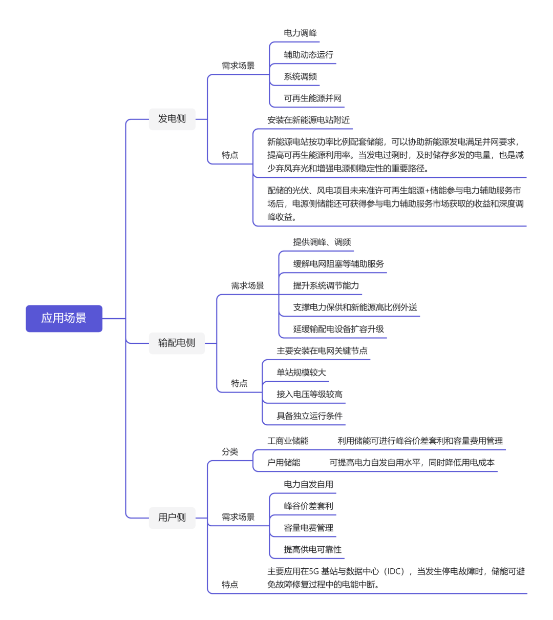 儲(chǔ)能的下游應(yīng)用主要為電網(wǎng)、電站運(yùn)營和戶用等。因此相關(guān)企業(yè)要想在這些領(lǐng)域建立自身的競爭優(yōu)勢,需要通過經(jīng)濟(jì)性和成本優(yōu)勢來構(gòu)建。根據(jù)儲(chǔ)能的應(yīng)用場景,儲(chǔ)能可分為發(fā)電側(cè)、輸配電側(cè)和用戶側(cè)等。