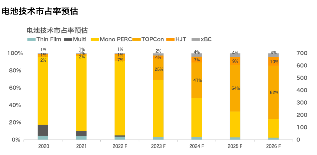 TOPCon電池是光伏晶硅電池的一種,近年來,由于其高轉(zhuǎn)換效率、低衰減性能、高量產(chǎn)性價(jià)比等明顯優(yōu)勢,逐步被行業(yè)企業(yè)采納。TOPCon電池理論極限效率高達(dá)28.7%,是最接近晶體硅太陽電池理論極限效率(29.43%)的技術(shù),遠(yuǎn)高于PERC(24.5%),具有非常大的研發(fā)潛力。2023年作為TOPCon技術(shù)爆發(fā)的一年,市占率有望占比超過25%。