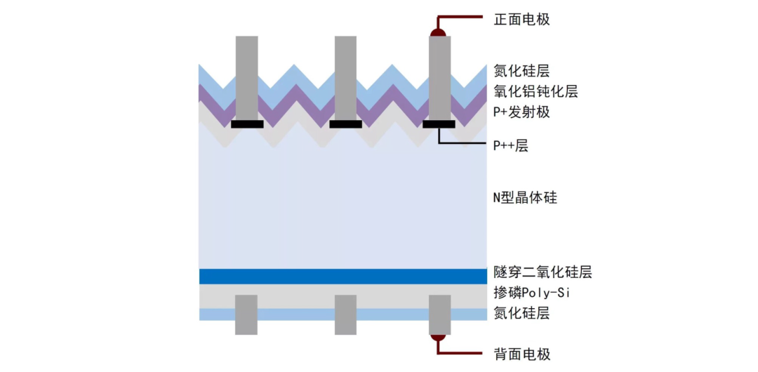 從時(shí)間上來看,TOPCon電池技術(shù),最早是由德國Fraunhofer太陽能研究所在2014年提出的一種新型鈍化接觸太陽能電池。從結(jié)構(gòu)上來看,TOPCon是一種基于選擇性載流子原理的隧穿氧化層鈍化接觸(Tunnel Oxide Passivated Contact)太陽能電池技術(shù),其電池結(jié)構(gòu)為N型硅襯底電池,在電池背面制備一層超薄氧化硅,然后再沉積一層摻雜硅薄層,二者共同形成了鈍化接觸結(jié)構(gòu),有效降低表面復(fù)合和金屬接觸復(fù)合。