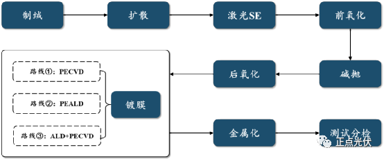 單晶PERC太陽能電池片的生產(chǎn)過程包括制絨、擴散、激光SE、前氧化、堿拋、后氧化、鍍膜、金屬化、測試分檢等主要工藝步驟。其具體工藝流程圖如下: