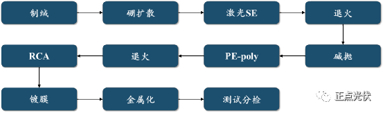 單晶N型TOPCon太陽能電池片的生產(chǎn)過程包括制絨、硼擴散、激光SE、退火、堿拋、PE-poly、退火、RCA、鍍膜、金屬化、測試分檢等主要工藝步驟。其具體工藝流程圖如下: