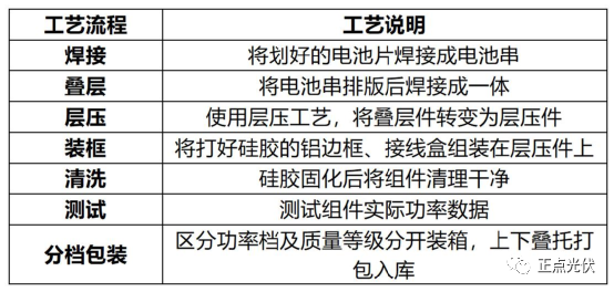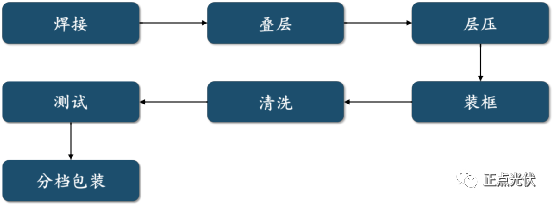 組件的生產(chǎn)過程包括焊接、疊層、層壓、裝框、清洗、測試、分檔包裝等主要工藝步驟,具體工藝流程圖如下: