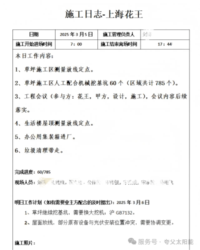 從夸父新能源此次項(xiàng)目的施工日志中,更能直觀感受到其在項(xiàng)目執(zhí)行過(guò)程中的嚴(yán)謹(jǐn)與專(zhuān)業(yè)。施工伊始,便對(duì)工人進(jìn)行入場(chǎng)安全教育,確保所有工人在施工前接受必要的安全培訓(xùn),從源頭上保障施工安全。在草坪施工區(qū),對(duì)施工區(qū)域進(jìn)行精確測(cè)量放線(xiàn),無(wú)論是人工開(kāi)挖還是人工配合機(jī)械挖基坑,都有條不紊地推進(jìn),為后續(xù)的混凝土支墩施工做好充分準(zhǔn)備。
