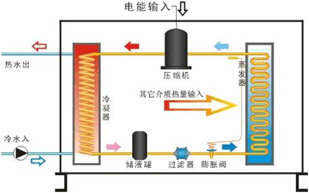 空氣源熱泵是由電動(dòng)機(jī)驅(qū)動(dòng),利用蒸汽壓縮制冷循環(huán)工作原理:蒸發(fā)器通過吸收空氣中的熱量,將低溫低壓的氣液混合體轉(zhuǎn)化為常溫低壓氣體,通過壓縮機(jī)被壓縮為高溫高壓的氣體,在冷凝器中將熱量傳遞為水,加熱水。冷凝器中出來的是常溫高壓的氣液混合體,在膨脹閥節(jié)流、降低壓力的作用后,變?yōu)榈蜏氐蛪旱臍庖夯旌象w,再一次進(jìn)入蒸發(fā)器進(jìn)行循環(huán)。