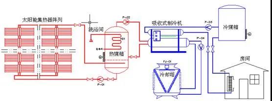太陽(yáng)能光熱轉(zhuǎn)換型制冷空調(diào)系統(tǒng)主要由太陽(yáng)能集熱器陣列、熱驅(qū)動(dòng)制冷機(jī)、冷媒箱、熱媒箱、控制系統(tǒng)和輔助冷/熱源等設(shè)備組成。