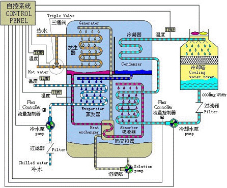 太陽(yáng)能是一種取之不盡、用之不竭的可再生綠色能源,地球每年接受的太陽(yáng)能總量為1×1018kWh,太陽(yáng)能驅(qū)動(dòng)制冷空調(diào)系統(tǒng)具有環(huán)保和節(jié)能的雙重優(yōu)勢(shì)。太陽(yáng)能制冷的利用途徑分為以下三種:光熱轉(zhuǎn)換、光電轉(zhuǎn)換和光化轉(zhuǎn)換。光熱轉(zhuǎn)換是利用各種集熱器把太陽(yáng)能收集起來(lái),然后用收集到的熱能來(lái)驅(qū)動(dòng)太陽(yáng)能制冷空調(diào)裝置;光電轉(zhuǎn)換是將太陽(yáng)能轉(zhuǎn)化為電能來(lái)驅(qū)動(dòng)制冷系統(tǒng);光化轉(zhuǎn)換是先將太陽(yáng)能能轉(zhuǎn)化為化學(xué)能,然后進(jìn)行制冷/熱。目前,我公司主要開(kāi)展的是太陽(yáng)能光熱轉(zhuǎn)換型制冷空調(diào)系統(tǒng)。太陽(yáng)能空調(diào)系統(tǒng)主要由太陽(yáng)集熱器和吸收式制冷機(jī)兩部分構(gòu)成,兼顧供熱(水)和制冷兩個(gè)方面的應(yīng)用,可廣泛應(yīng)用于辦公摟、別墅、學(xué)校、醫(yī)院、酒店、游泳池、公寓等,為太陽(yáng)能熱利用技術(shù)開(kāi)辟了一個(gè)新的應(yīng)用領(lǐng)域。